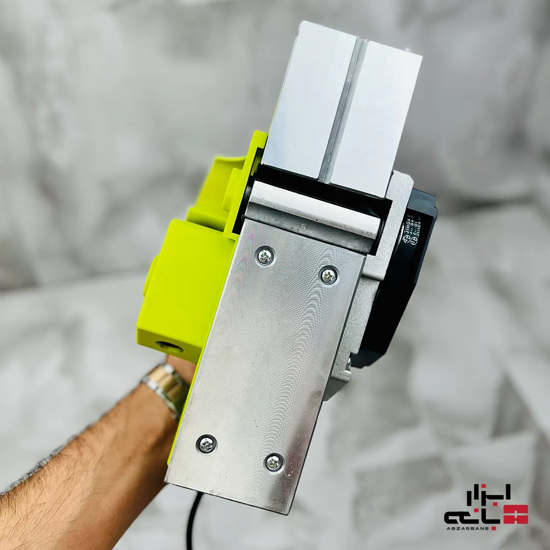علاوه بر این، کلید گازی به شما امکان کنترل لحظهای سرعت را میدهد. شما میتوانید با فشار انگشت، سرعت را به صورت تدریجی افزایش دهید که برای شروع و پایان یک پاس رندهکاری بدون ایجاد رد بر روی چوب، بسیار کاربردی است. برای دقت بیشتر در ایجاد لبههای صاف، یک گونیای فلزی نیز به همراه دستگاه ارائه میشود.