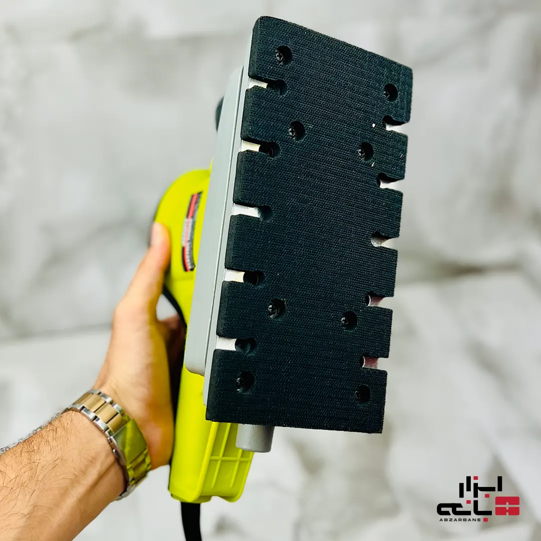 مهمترین ویژگی که این دستگاه را به ابزاری کارآمد برای پروژههای بزرگ تبدیل میکند، صفحه سنباده بزرگ مستطیلی آن با ابعاد 115 در 280 میلیمتر است. این ابعاد بزرگ (که معادل نصف یک ورق سنباده استاندارد است) مزایای کلیدی زیر را به همراه دارد: